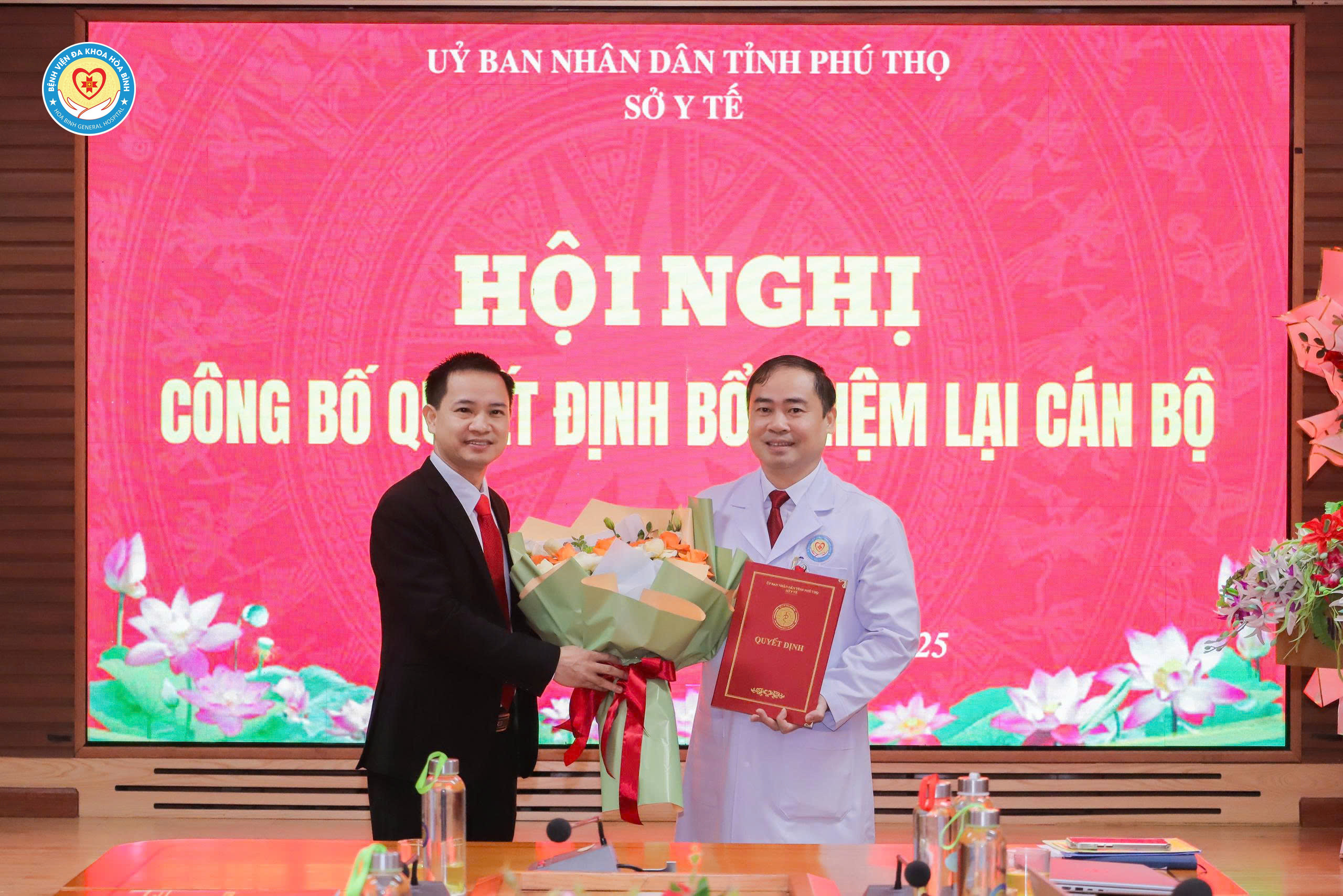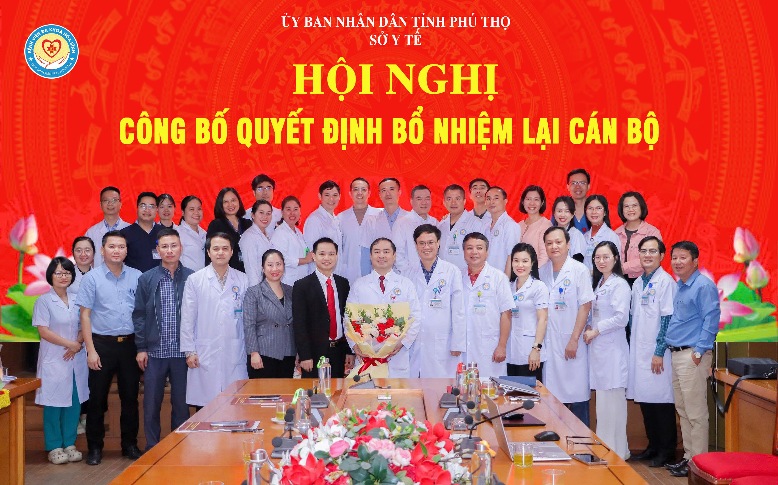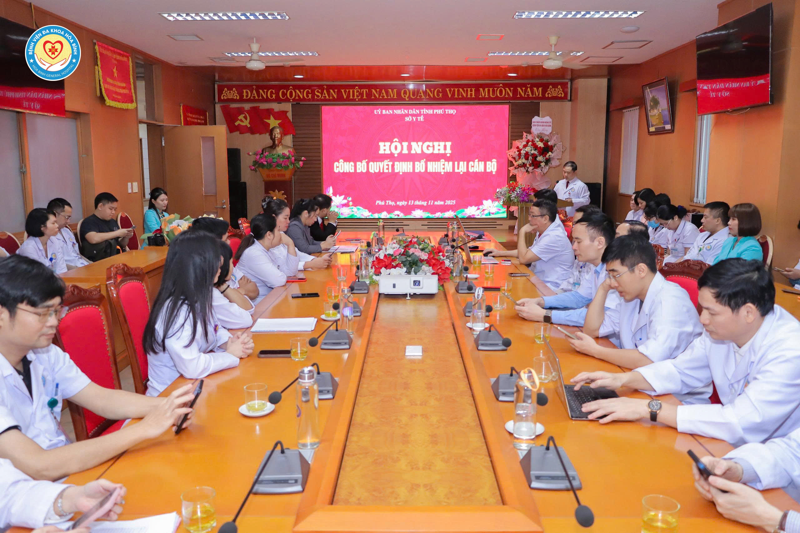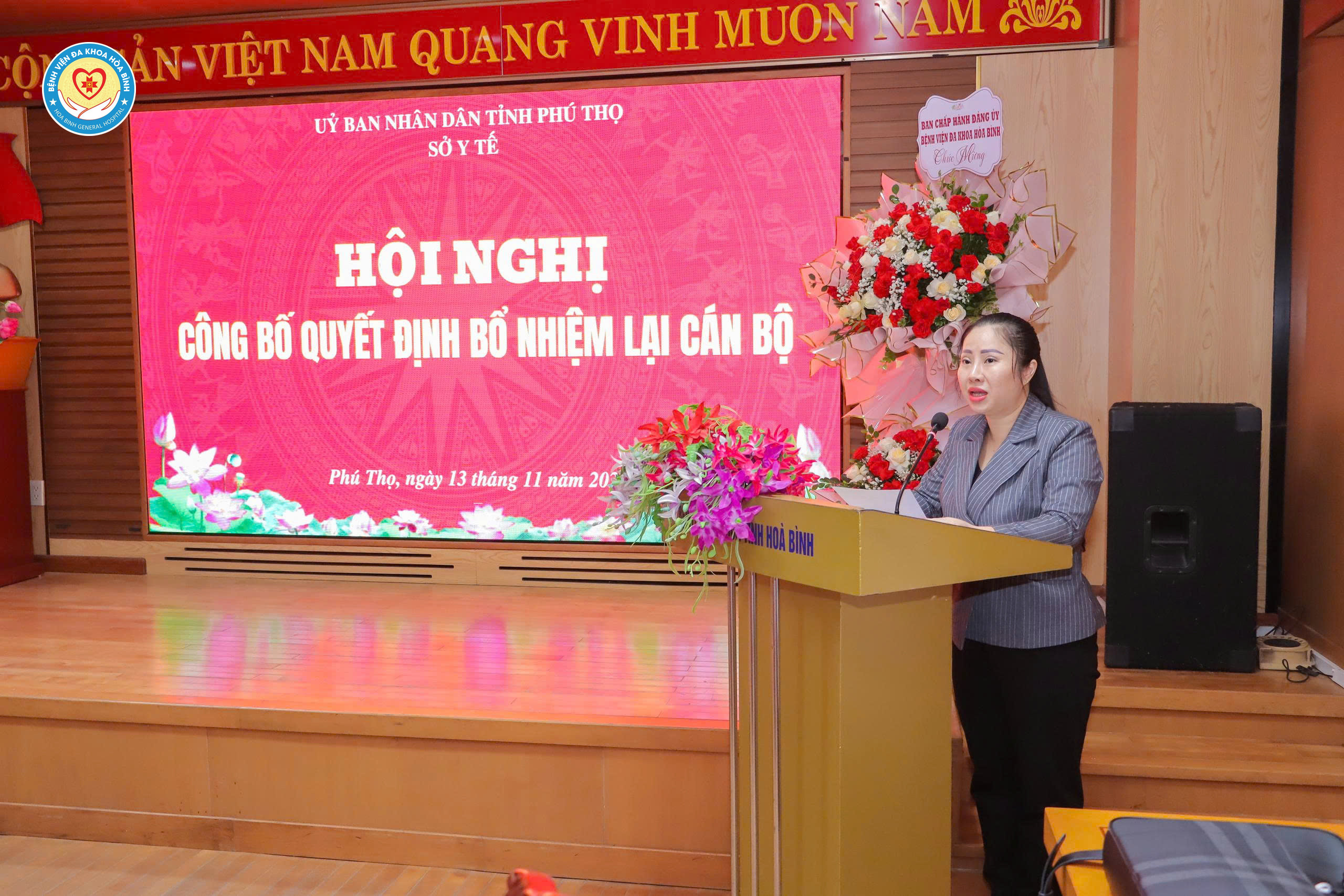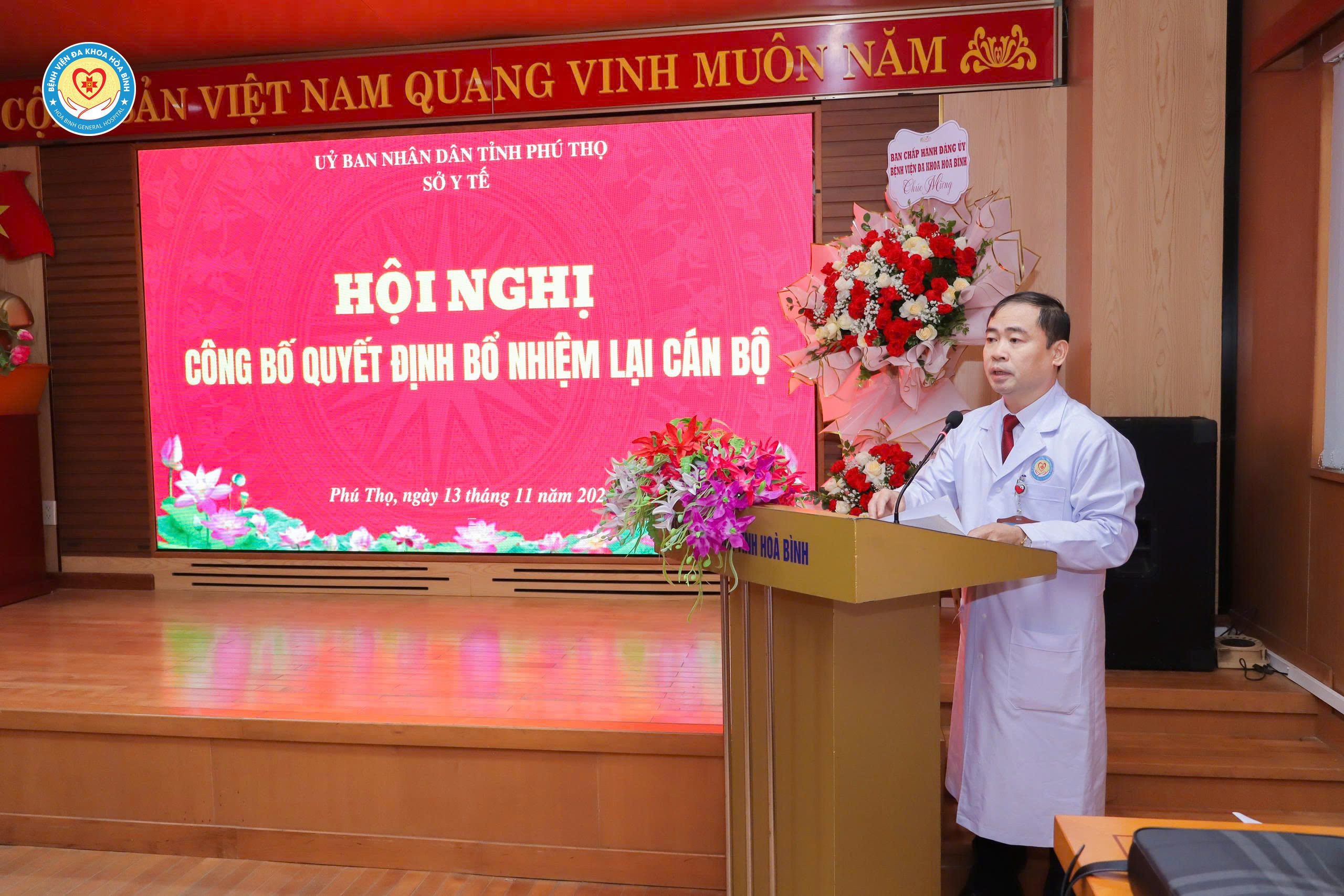 Tại Hội nghị, lãnh đạo phòng Tổ chức cán bộ Sở Y tế Phú Thọ thừa uỷ quyền Chủ tịch UBND tỉnh Phú Thọ đã công bố Quyết định số 1686/QĐ-UBND ngày 8/11/2025 về việc bổ nhiệm lại TS.BS Nguyễn Hoàng Diệu, Giám đốc Bệnh viện Đa khoa Hoà Bình. Theo Quyết định, TS.BS Nguyễn Hoàng Diệu được bổ nhiệm lại giữ chức Giám đốc Bệnh viện Đa khoa Hoà Bình trực thuộc Sở Y tế Phú Thọ trong thời hạn 5 năm kể từ ngày 02/11/2025.