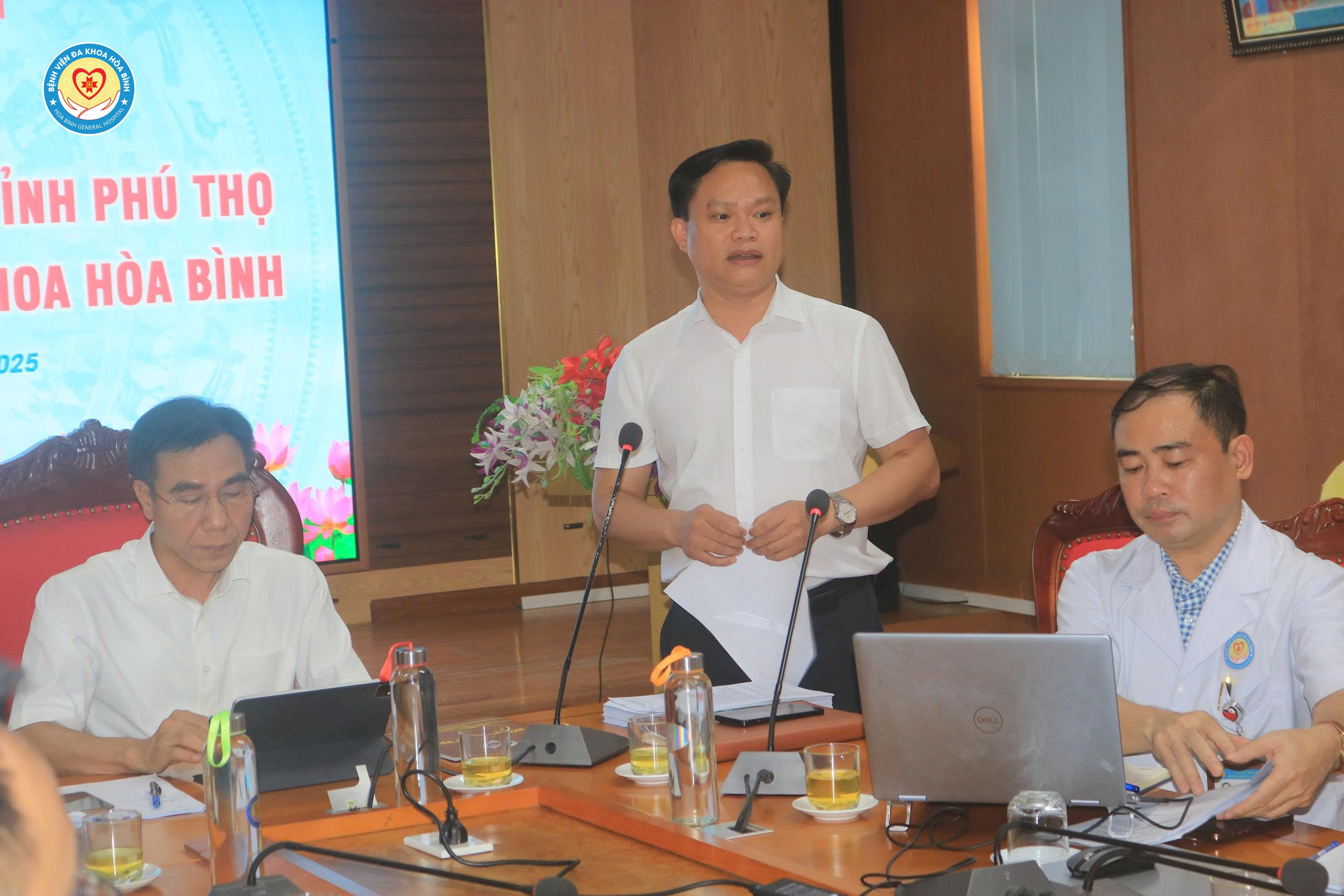 Ngày 10/10/2025, Đoàn công tác Sở Y tế tỉnh Phú Thọ do TS.BS Lê Hồng Trung – Tỉnh ủy viên, Giám đốc Sở Y tế làm Trưởng đoàn đã có buổi làm việc với Bệnh viện Đa khoa Hòa Bình về tình hình thực hiện nhiệm vụ 9 tháng đầu năm 2025, phương hướng, nhiệm vụ 3 tháng cuối năm 2025 và kế hoạch phát triển Bệnh viện giai đoạn 2026–2030. Tiếp và làm việc với Đoàn công tác có Ban Giám đốc Bệnh viện cùng đại diện lãnh đạo các khoa, phòng, trung tâm trực thuộc.