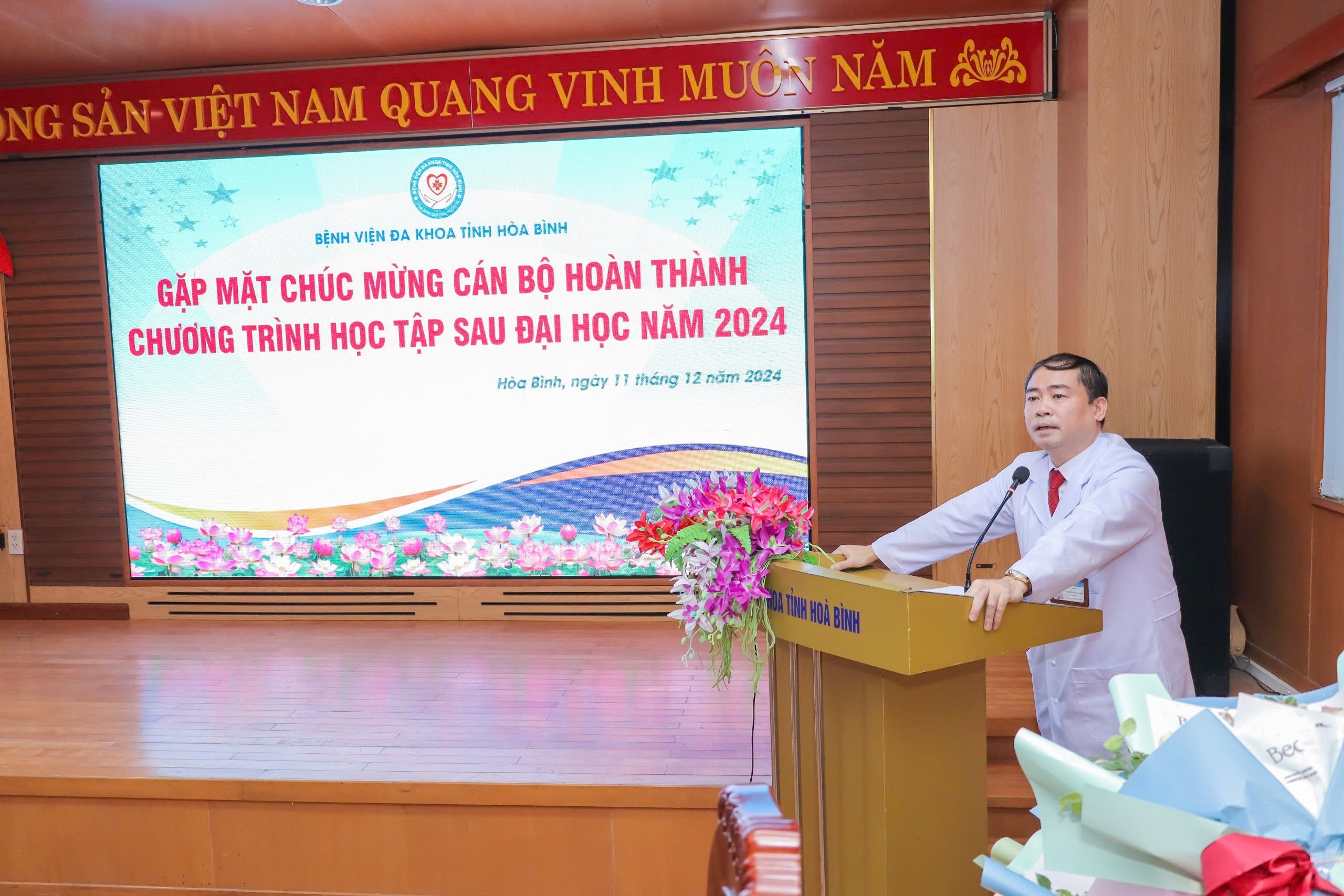Ngày 11/12, Bệnh viện Đa khoa tỉnh Hòa Bình tổ chức chương trình Gặp mặt chúc mừng cán bộ hoàn thành chương trình học tập sau đại học năm 2024. TTƯT.TS.BS Nguyễn Hoàng Diệu, Bí thư Đảng ủy, Giám đốc Bệnh viện dự và chúc mừng các cán bộ hoàn thành chương trình học sau đại học.