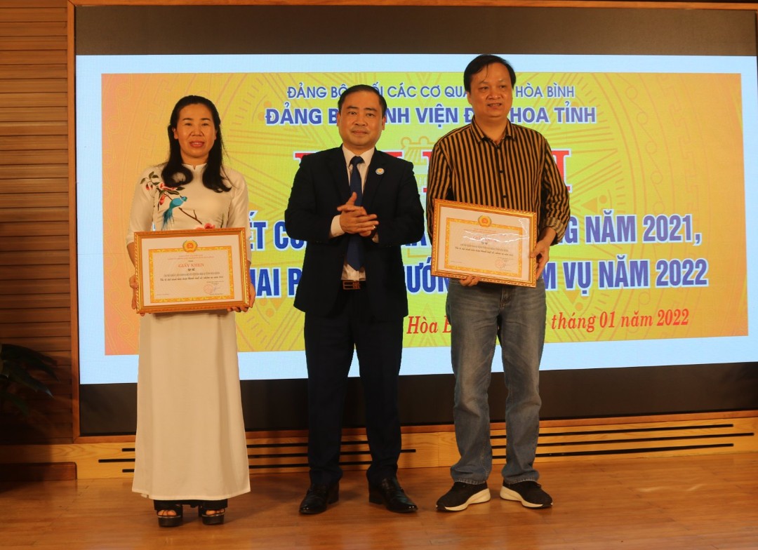 Nhân dịp này, Đồng chí Bí thư Đảng bộ Bệnh viện đã tặng Giấy khen cho 02 tập thể đạt danh hiệu hoàn thành xuất sắc nhiệm vụ năm 2021 gồm Chi bộ khối Liên khoa và Chi bộ khối Ngoại. Biểu dương 08 chi bộ trực thuộc Đảng bộ Bệnh viện là Chi bộ tiêu biểu trong năm 2021. Đảng uỷ khối các cơ quan tỉnh tặng Giấy khen cho 4 cá nhân của Bệnh viện đạt tiêu chuẩn Hoàn thành xuất sắc nhiệm vụ 5 năm liên tục từ 2017- 2021.