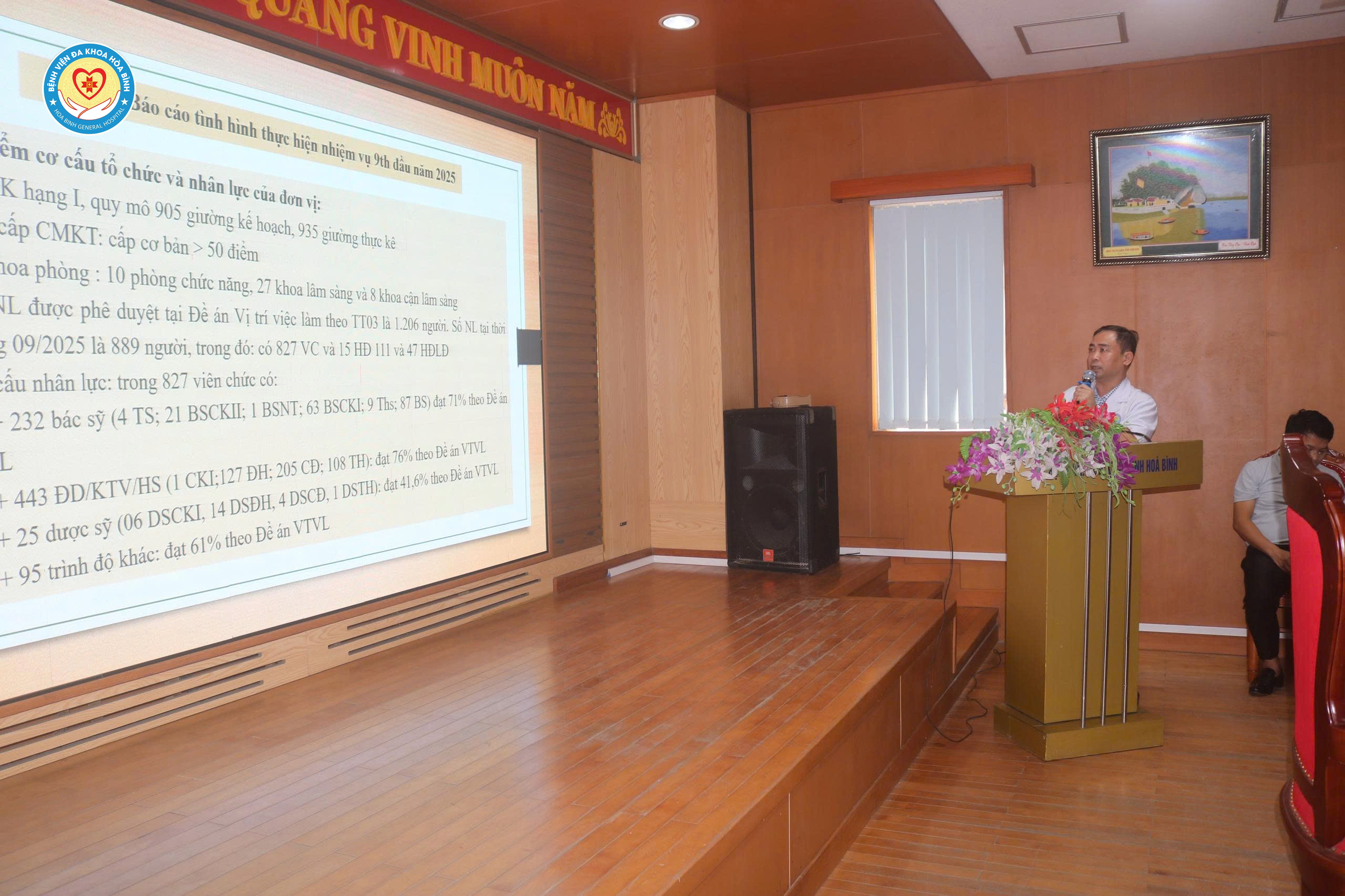 Bệnh viện Đa khoa Hòa Bình là bệnh viện đa khoa hạng I của tỉnh, có quy mô 905 giường bệnh, gồm 10 phòng chức năng và 35 khoa lâm sàng, cận lâm sàng, với tổng số 889 cán bộ, viên chức và người lao động. Trong 9 tháng đầu năm 2025, Bệnh viện đã cơ bản hoàn thành và vượt nhiều chỉ tiêu kế hoạch được giao. Tổng số lượt khám bệnh đạt hơn 182.000 lượt, bằng 131% kế hoạch; số lượt điều trị nội trú trên 32.000 lượt, đạt 110%; điều trị ngoại trú trên 9.000 lượt, đạt 101%. Các hoạt động về quản lý chất lượng, đào tạo, nghiên cứu khoa học, tài chính – kế toán, xã hội hóa y tế, quản lý nhân lực, đầu tư trang thiết bị… đều được triển khai đồng bộ, hiệu quả, góp phần nâng cao chất lượng khám chữa bệnh và uy tín của Bệnh viện. Tại buổi làm việc, Đoàn công tác Sở Y tế đã nghe Bệnh viện báo cáo chi tiết về các lĩnh vực công tác tổ chức cán bộ, tài chính – kế toán, quản lý tài sản, đầu tư trang thiết bị, cũng như các hoạt động chuyên môn trọng điểm như y học cổ truyền, phục hồi chức năng, ngoại tiết niệu – nam học, ung bướu, hồi sức cấp cứu, đột quỵ, răng hàm mặt, chấn thương chỉnh hình… Đồng thời, Bệnh viện cũng báo cáo tiến độ triển khai dự án mở rộng Khoa Khám bệnh và công tác giải phóng mặt bằng, đền bù phục vụ Đề án mở rộng Bệnh viện Đa khoa Hòa Bình.
