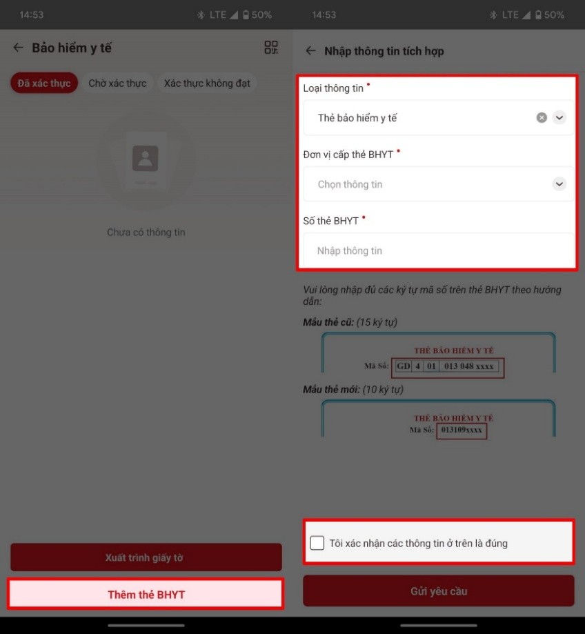 Chọn tiếp vào mục Thêm thẻ BHYT > Điền đầy đủ thông tin cá nhân theo yêu cầu và gửi yêu cầu tích hợp.
