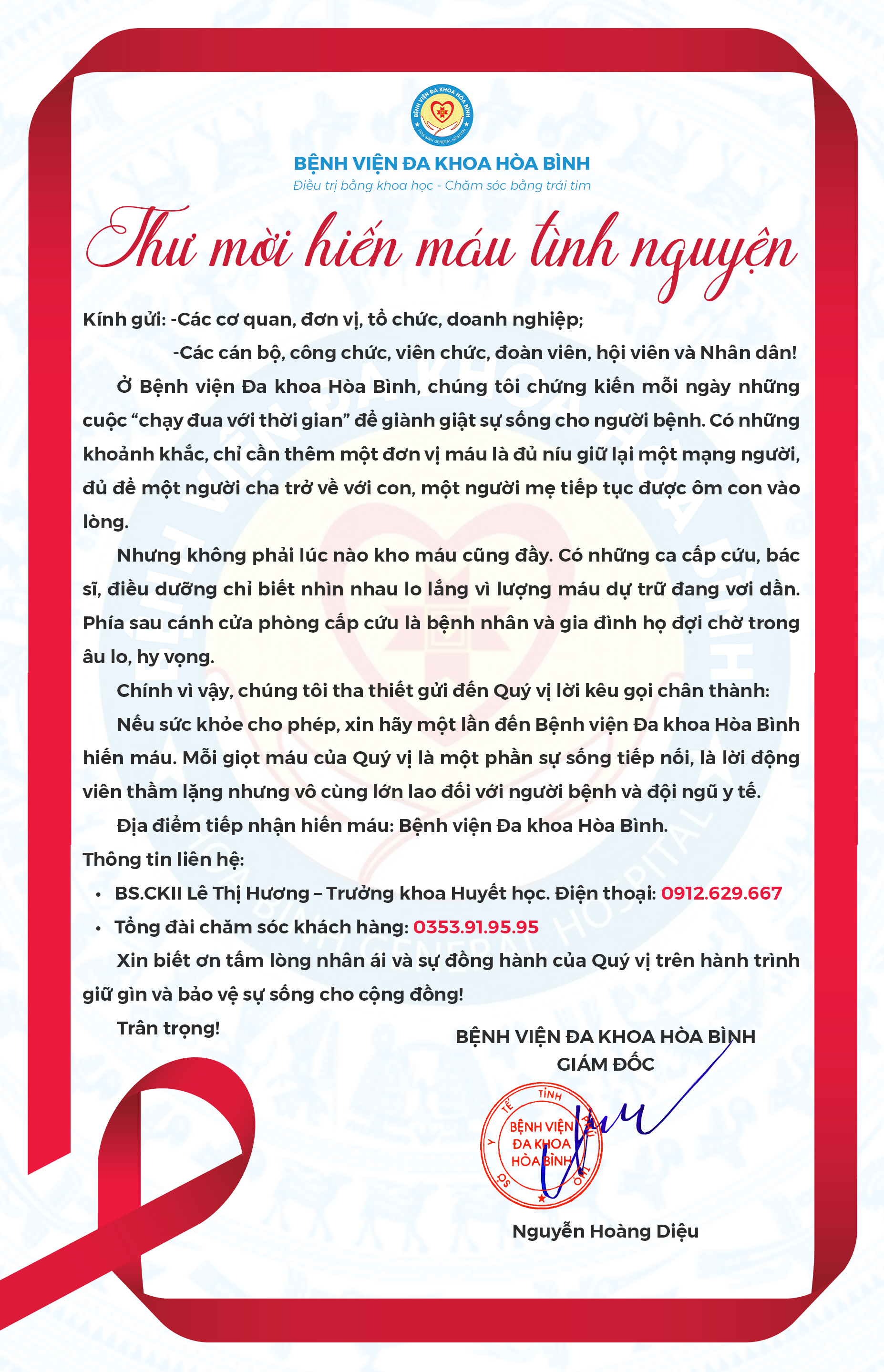 Nếu sức khỏe cho phép, xin hãy một lần đến Bệnh viện Đa khoa Hòa Bình hiến máu. Mỗi giọt máu của Quý vị là một phần sự sống tiếp nối, là lời động viên thầm lặng nhưng vô cùng lớn lao đối với người bệnh và đội ngũ y tế.